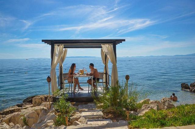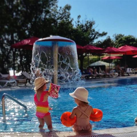 Nejbližší hotelová pláž se nachází cca 30 m od hotelu. Pláž je tvořena převážně kameny a betonovými plochami. Nicméně menší zálivy jsou tvořeny i drobnými oblázky. Doporučujeme s sebou vzít i obuv do vody. Slunečníky a lehátka mají všichni klienti zdarma (dle dostupnosti). Na letní sezónu 2026 budou k dispozici vodní sporty jako kajaky, pedl boardy a dětský nafukovací aquapark (zdarma, dle dostupnosti). Nápoje v rámci služby all inclusive budou taky v plážovém baru. Cestujete s dětmi?Děti do 11,99 let mají pobyt na přistýlce zdarma. Druhé dítě do 4,99 let bez nároku na lůžko je také zdarma (dítě spí na posteli s rodiči). Dětskou postýlku lze zapůjčit zdarma (na vyžádání předem u CK, omezená dostupnost). Pro děti je připravena herna, playstation, trampolína a různé dětské animační programy. Na letní sezónu 2026 pribudne k animačnímu programu také letní kino pod hvězdami (dle počasí), minigolf, sporty na pláži, nafukovací aquapark, bufetový koutek v jídelně a také dětský koutek s bazénky s míčky. Tipy na výlety