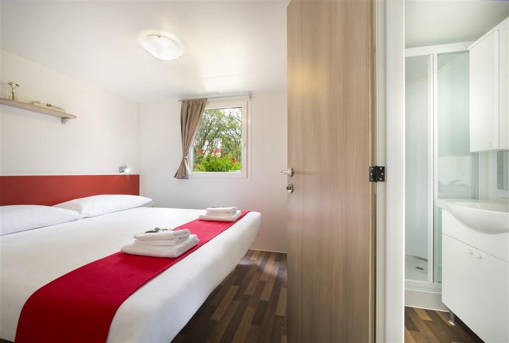 Každý mobilní dům má zhruba 32 m² a je určen pro 4-6 osob. Ubytování zahrnuje dvě ložnice (jednu s manželskou postelí, druhou se dvěma samostatnými postelemi), obývací prostor s rozkládací pohovkou pro 1 dospělou osobu nebo 2 děti, plně vybavenou kuchyň s mikrovlnnou troubou, lednicí a spotřebiči. K dispozici jsou dvě koupelny se sprchovým koutem, fén, SAT TV, trezor, klimatizace, WiFi zdarma. Před domkem najdete terasu vybavenou zahradním nábytkem. Terasa u mobilních domků Mirami Premium je navíc krytá závěsy a je zde stojan na kola. |
